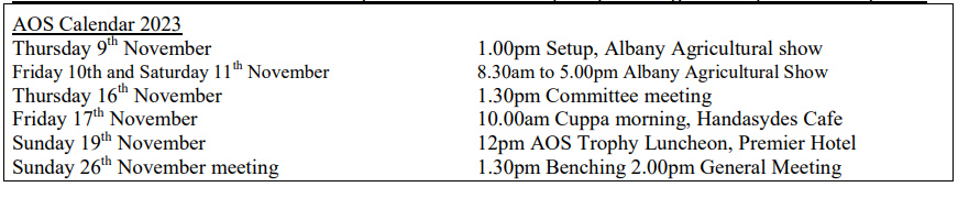 On Sunday 19th November at 12pm a trophy luncheon will be held at the Premier Hotel, a special event to celebrate with our members on their successes at our shows. The trophies and awards from both the winter and spring shows will be presented at the luncheon. We will be seated in the upstairs dining room. When you arrive at the hotel you can order and pay for your meals and drinks downstairs then get the lift up to the dining room; we have the room booked exclusively for AOS members. Here is a link to the Premier Hotel’s menu to copy and paste into your google search bar. https://premierhotelalbany.com.au/food-drinks/
